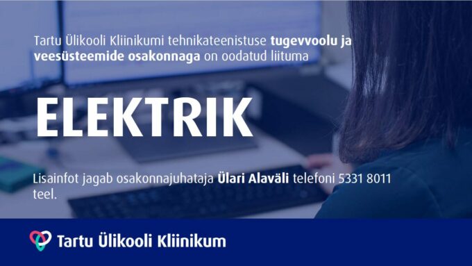 Tartu Ülikooli Kliinikumi tehnikateenistuse tugevvoolu ja veesüsteemide osakond ootab oma meeskonnaga liituma täistööajaga (1,0 koormusega) elektrikut, kelle peamisteks tööülesanneteks on Kliinikumile kuuluvates hoonetes elektritööde teostamine ning erinevate elektripaigaldise/automaatika süsteemide hooldamine.