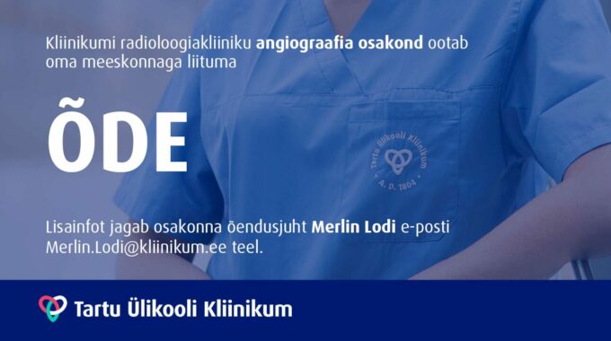Tartu Ülikooli Kliinikumi radioloogiakliiniku angiograafia osakond ootab oma meeskonnaga liituma täistööajaga (1,0 koormusega) õde, kelle peamisteks töökohustusteks on angiograafilistel protseduuridel patsientidele kvaliteetse õendusabi osutamine ning selle käigus õendustegevuse ja protseduuri dokumenteerimine.