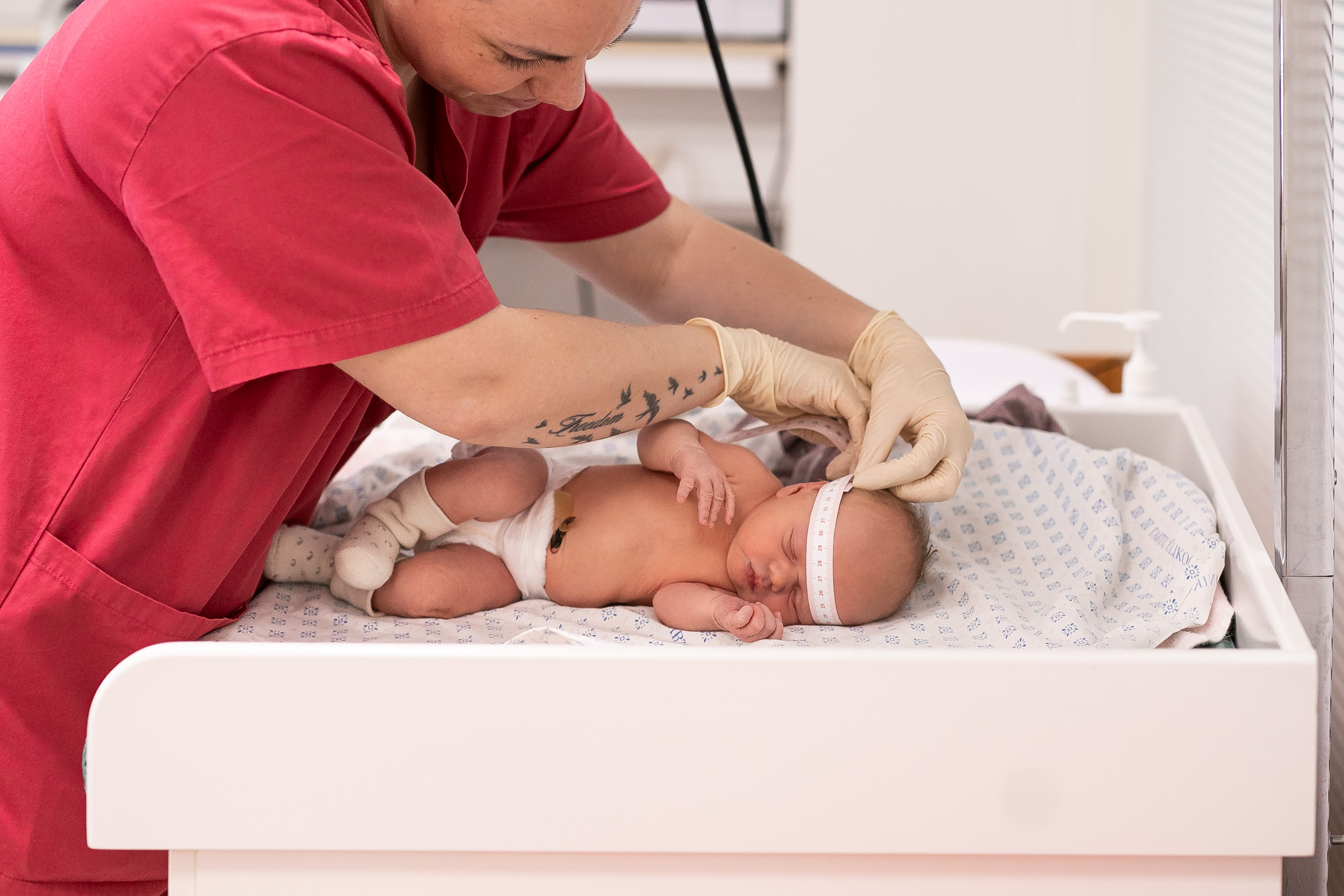 Mõõtmine, kaalumine, registreerimine. Lapse üsasisese arengu ja edaspidise kasvamise hindamiseks mõõdetakse vastsündinu kaal, pikkus, pea ja rinna ümbermõõt. Ajaline vastsündinu kaalub keskmiselt 3200-3800 grammi, tema pikkus on 46-54cm, mis mõõdetakse pealaest kuni väljasirutatud jala kannani. Peaümbermõõt on enamasti 34-36cm. Mõõdulint kulgeb kulmude kohalt ja kuklalt kõige väljaulatuvama koha pealt. Pea mõõdetakse üle enne kojuminekut, sest selle kuju kohaneb sünnituse käigus sünnitusteede järgi ja mõne päeva pärast võib selle kuju muutuda. Rinnaümbermõõt mõõdetakse rinnanibude kõrguselt ja on enamasti kas pea ümbermõõduga võrdne või 2-3cm väiksem.