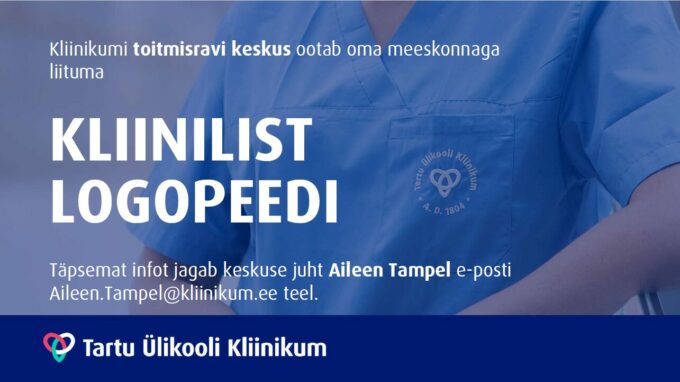 Tartu Ülikooli Kliinikumi toitmisravi keskus ootab oma meeskonnaga liituma osatööajaga (0,3 koormusega) kliinilist logopeed, kelle peamisteks tööülesanneteks on ambulatoorselt ja statsionaarselt toitmisravi konsultatsioonide raames patsiendi neelamisfunktsiooni hindamine ning neelamishäire ravi planeerimine.