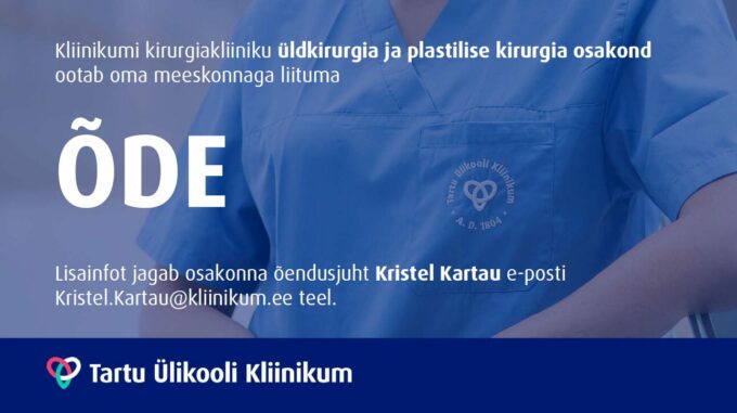 Tartu Ülikooli Kliinikumi kirurgiakliiniku üldkirurgia ja plastilise kirurgia osakond ootab oma meeskonnaga liituma täistööajaga (1,0 koormusega) õde, kelle peamisteks tööülesanneteks on jälgimispalati ja osakonna patsientide pre- ja postoperatiivne jälgimine ning õendustoimingute teostamine.