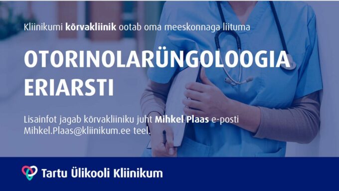 Tartu Ülikooli Kliinikumi kõrvakliinik kuulutab välja konkursi osatööajaga (0,3 koormusega) otorinolarüngoloogia eriarsti ametikoha täitmiseks alates 1. aprillist 2026.
